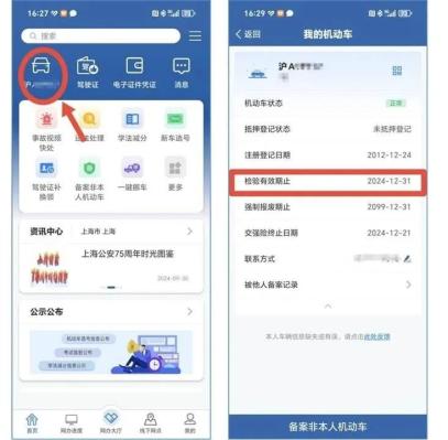 查询机动车检验有效期:在APP首页左上角点击绑定车辆,“我的机动车”中显示检验有效期信息。