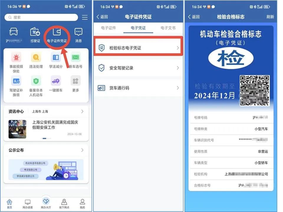 查询检验合格标志电子凭证:在APP首页上方点击“电子证件凭证”——“检验标志电子凭证”栏目,即显示电子凭证信息。