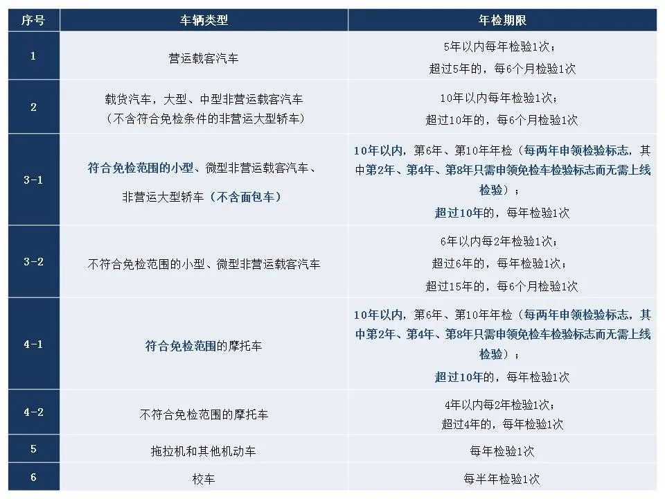 9座(包含9座)以下的非营运小微型载客汽车、非营运大型轿车、摩托车(面包车除外),10年内每两年申领检验合格标志,其中第2年、第4年、第8年只需通过“交管12123”APP在线申领免检车检验标志而无需上线检验;第6年、第10年需进行上线检验。10年以后每年上线检验1次。年检可在车辆检验有效期满前三个月内申请办理。但是,车辆存在下列情况的,不享受机动车“免检”政策,仍需按原规定上线检验: