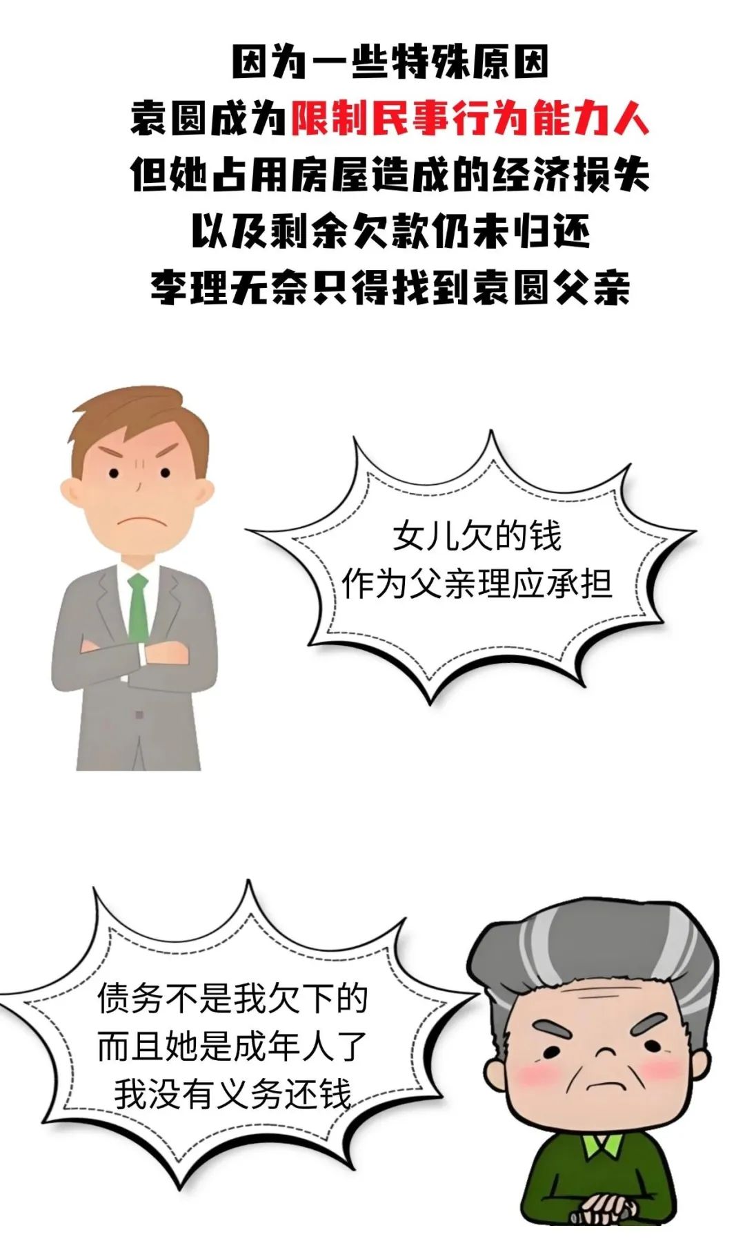 袁圆作为成年人,是不能完全辨认自己行为的限制民事行为能力人,她对李理造成的财产损害,其父作为监护人,理应承担责任。《中华人民共和国民法典》第一千一百八十八条第二款规定,“有财产的无民事行为能力人,限制民事行为能力人造成他人损害的,从本人财产中支付赔偿费用;不足部分,由监护人赔偿”。所以,房屋占用费依法先从袁圆本人财产中支付,不足部分要由袁圆父亲支付。