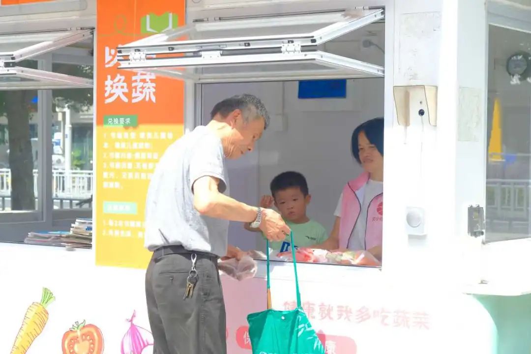 据悉,本次活动面向居民招募了3个义卖摊主,“以书换蔬”做公益。“只需2本闲置儿童类书籍,就能换取一袋新鲜蔬菜哦。”现场,蔬菜换购亭里摆放着青菜、西蓝花、胡萝卜及番茄等10余种新鲜蔬菜,居民们迫不及待地拿着书籍前来兑换。