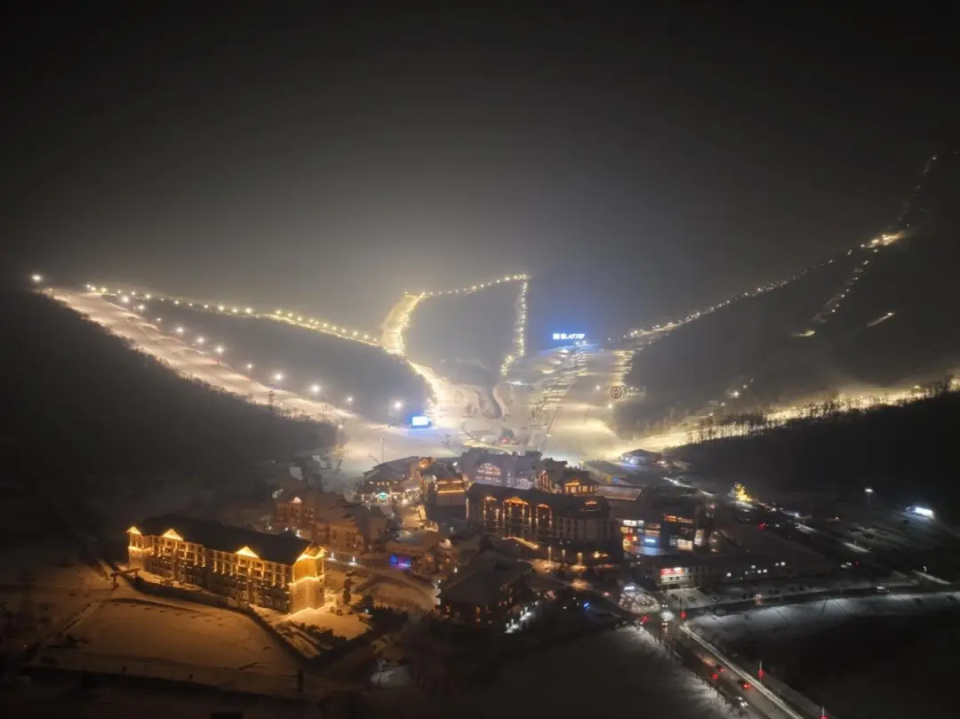 鸟瞰北大湖滑雪场夜滑雪道,华灯璀璨,宛如冰雪童话中一只蝴蝶翩然起舞。