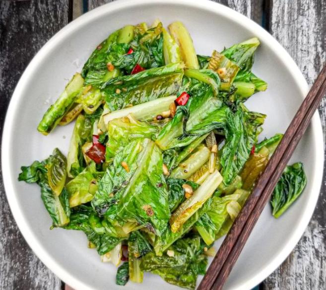 将莴笋叶洗净后切段,用热油和蒜末快炒,加入少许盐调味,保留其清香和营养。