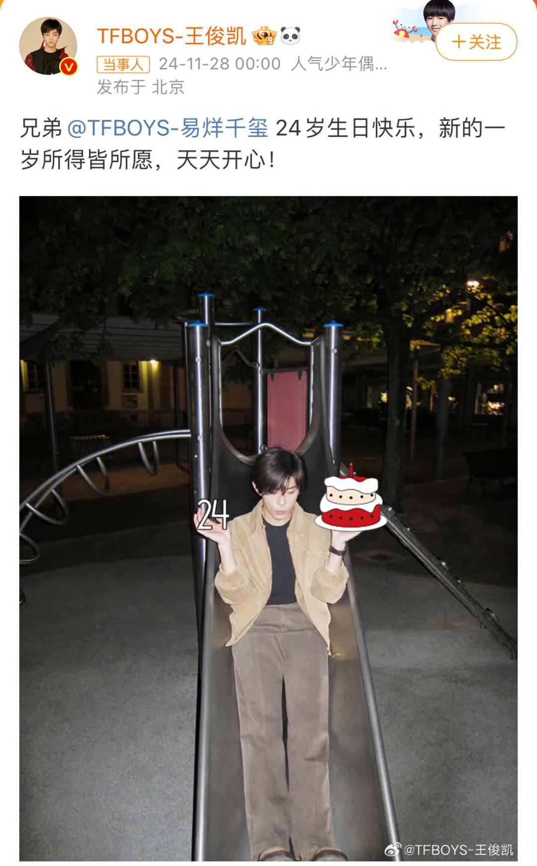 11月28日凌晨零点,王俊凯和王源分别在社交媒体上为易烊千玺庆祝24岁生日。王俊凯发文祝愿兄弟易烊千玺生日快乐,新的年龄里一切顺利,每天开心。