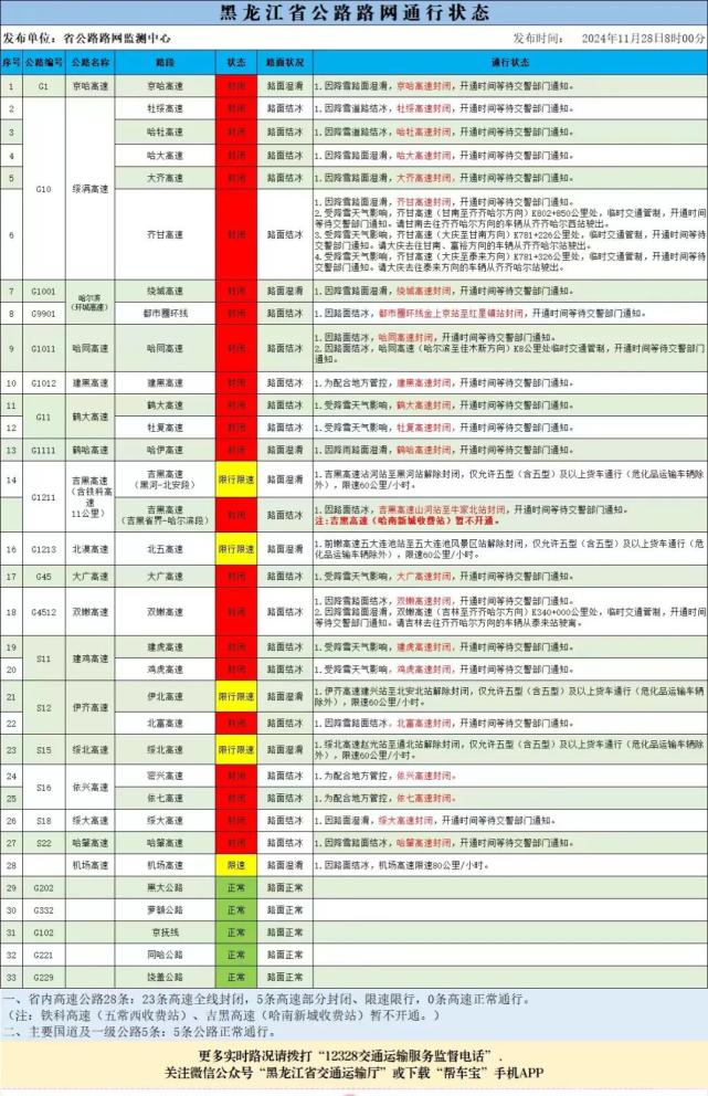11月28日8时汇总路况信息:全线封闭的高速有(23条高速):牡绥高速、鹤大高速、建虎高速、北富高速、齐甘高速、大齐高速、依七高速、鸡虎高速、密兴高速、建黑高速、牡复高速、鹤哈高速、吉黑高速(吉黑省界-哈尔滨段)、都市圈环线、双嫩高速、大广高速、绥大高速、哈牡高速、哈同高速、哈大高速、哈肇高速、京哈高速、哈尔滨绕城高速,封闭。限行限速的高速有(5条高速):北漠高速、绥北高速(赵光站至通北站)、伊北高速、吉黑高速(黑河-北安段),仅允许五型(含五型)及以上货车通行(危化品运输车辆除外),限速60公里/小时。机场高速,限速80公里/小时。