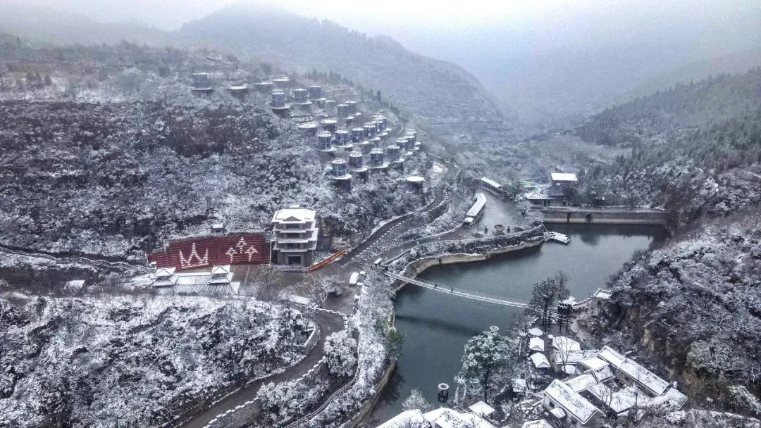 银装素裹下的山峰层峦叠嶂,春秋湖则俨然晶莹的翡翠。