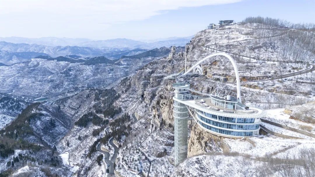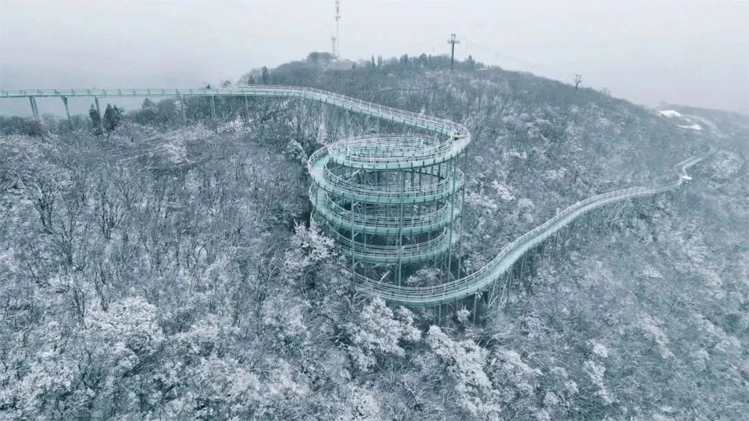 等一场冬雪来到景区,漫步在柿岩的阶梯之上,极目远眺,漂流滑道萦绕在山峰间似丝带一般,黛青色的丛山在云海中若隐若现,呈现出一幅浑然天成的山水画卷。