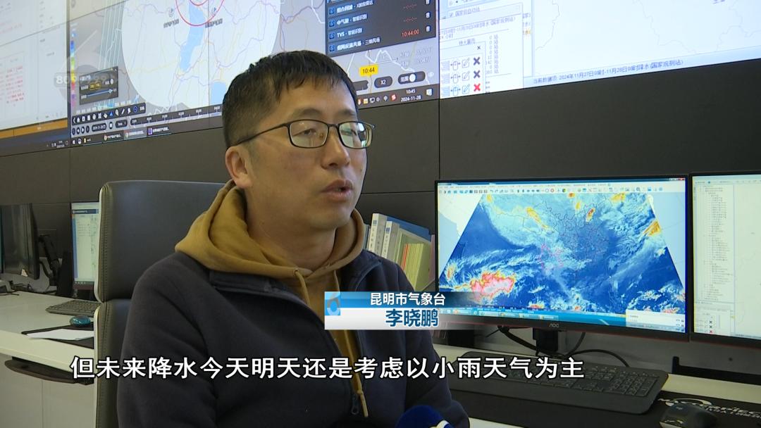 昆明市气象台预报员李晓鹏说:“因为现在全国大部分地区都进入了冬季,都处在干季的状态,这个时间段在全国来看(昆明)降水相对就比较多,虽然雨量并不大,但从全国排名来看相对就比较多一些,今天明天还是以小雨天气为主,到周末就会转为多云到晴的天气,冷空气也结束,也不会再出现降雨的过程。”