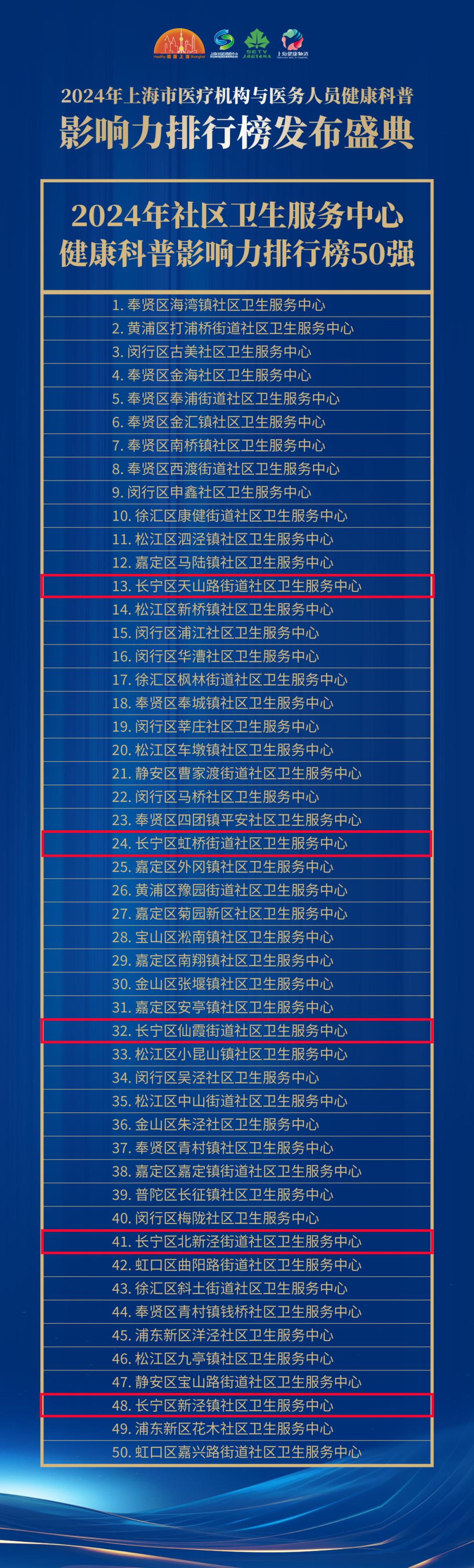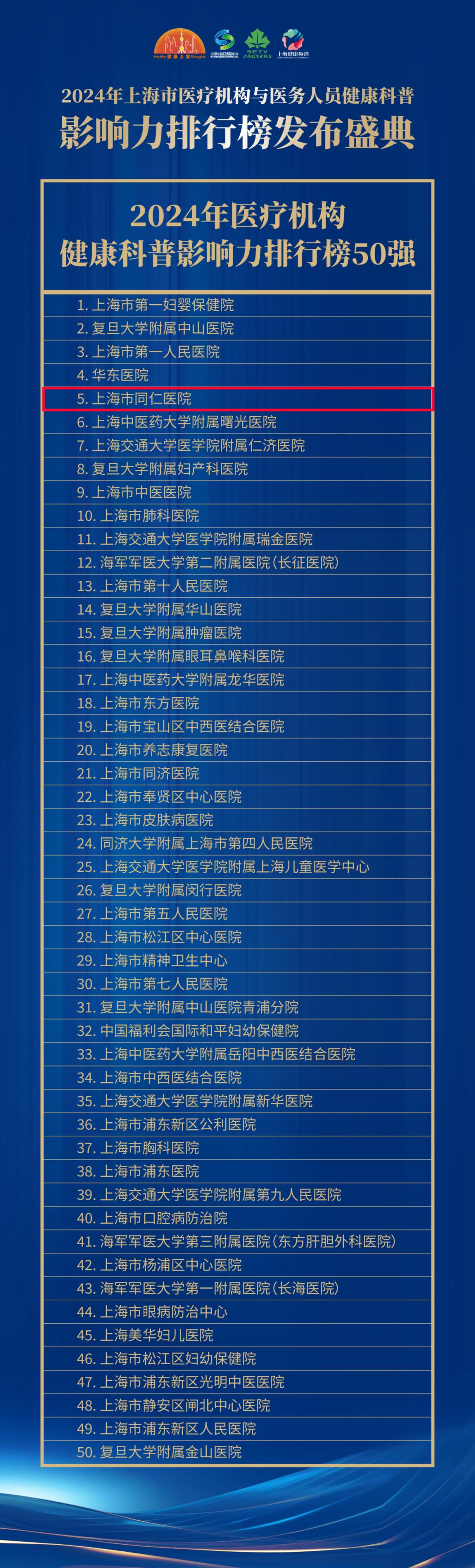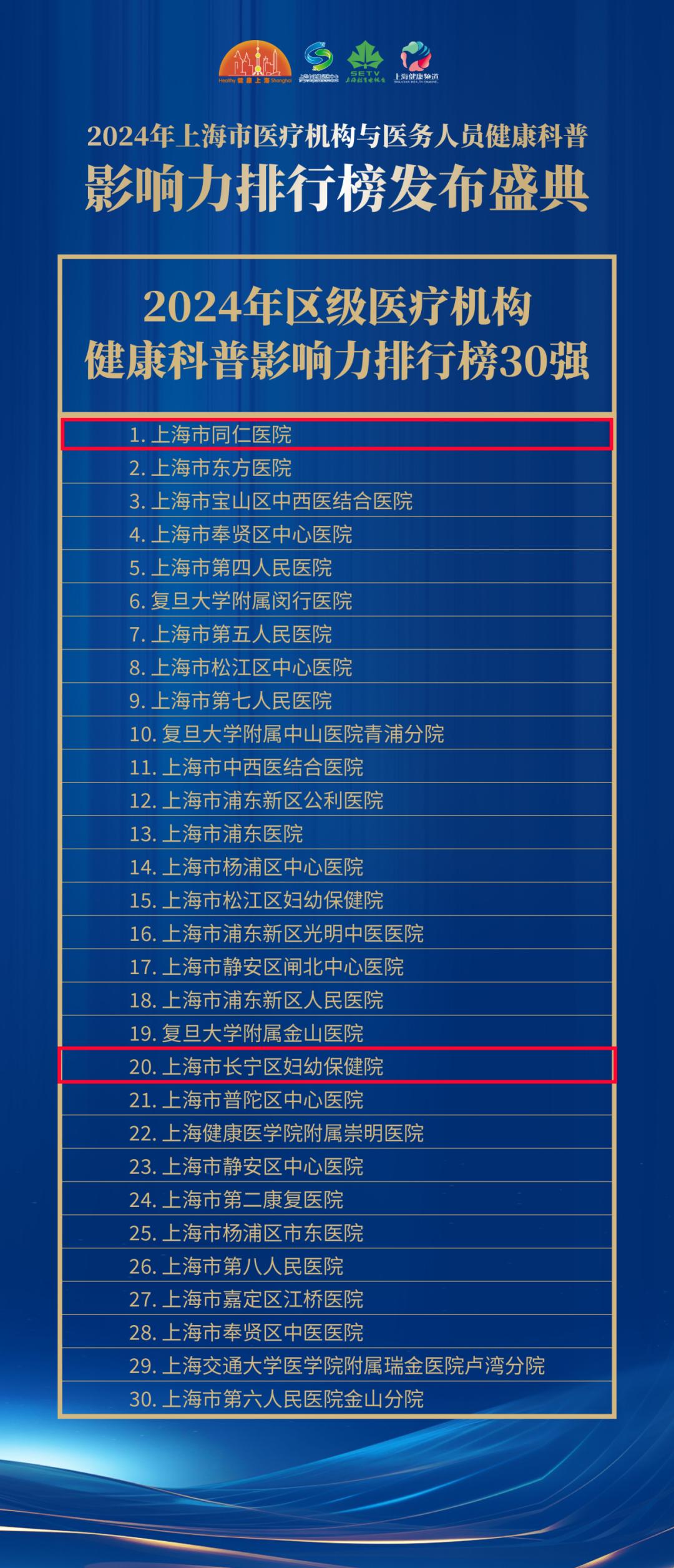 上海市同仁医院入选医疗机构健康科普影响力排行榜50强;上海市同仁医院、长宁区妇幼保健院入选区级医疗机构健康科普影响力排行榜30强;天山路街道社区卫生服务中心、虹桥街道社区卫生服务中心,仙霞街道社区卫生服务中心、北新泾街道社区卫生服务中心、新泾镇社区卫生服务中心入选社区卫生服务中心健康科普影响力排行榜50强。