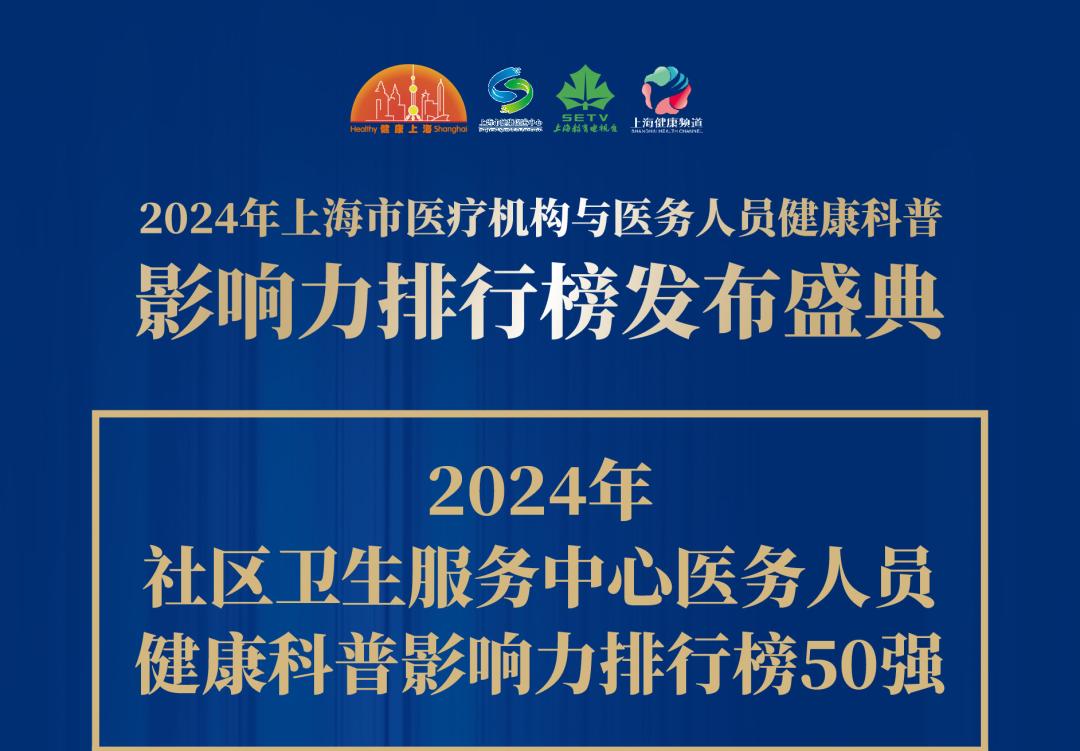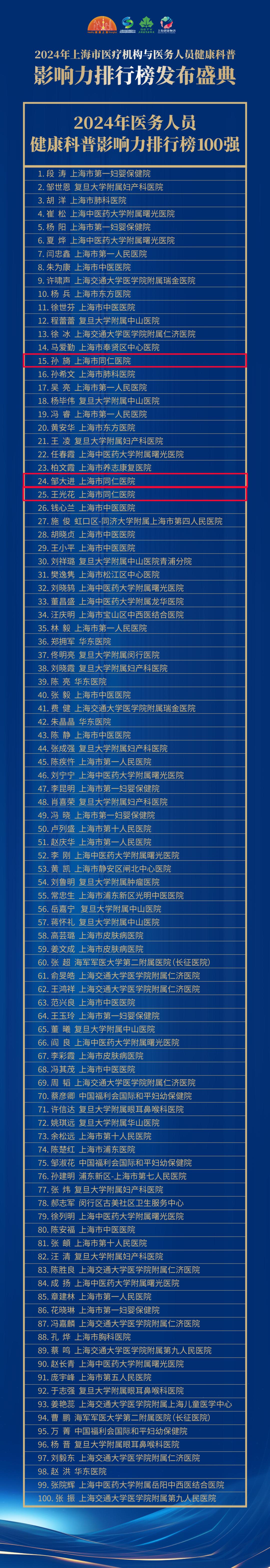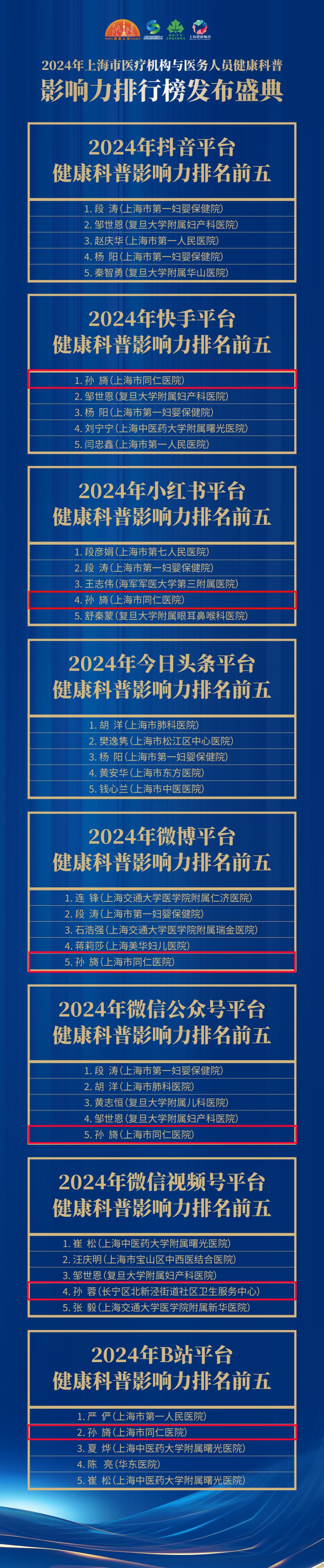 (点击查看大图)上海市同仁医院孙旑等3人入选医务人员健康科普影响力指数排行榜100强;北新泾街道社区卫生服务中心孙蓉等4人入选社区卫生服务中心医务人员健康科普影响力排行榜50强。
