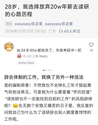 “28岁,我选择放弃20w年薪去读研”“我34岁65w都放弃了,年底考研冲一把”“为了读研,辞去体制的工作,我换了另外一种活法”……这是几位大龄考研人近期在社交媒体发表的自述帖子和评论。