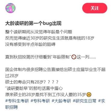 据统计,在120篇大龄考研的相关帖子中,疑虑年龄过大的帖子便占了19.5%。他们最担忧的一点,是大龄毕业的未来就业问题。在网上,时常会刷到大龄毕业生抱怨“毕业后找不到工作”、“读研找的工作还不如先前”等帖子,这或许和整个就业环境高度强调年龄的重要性有关。