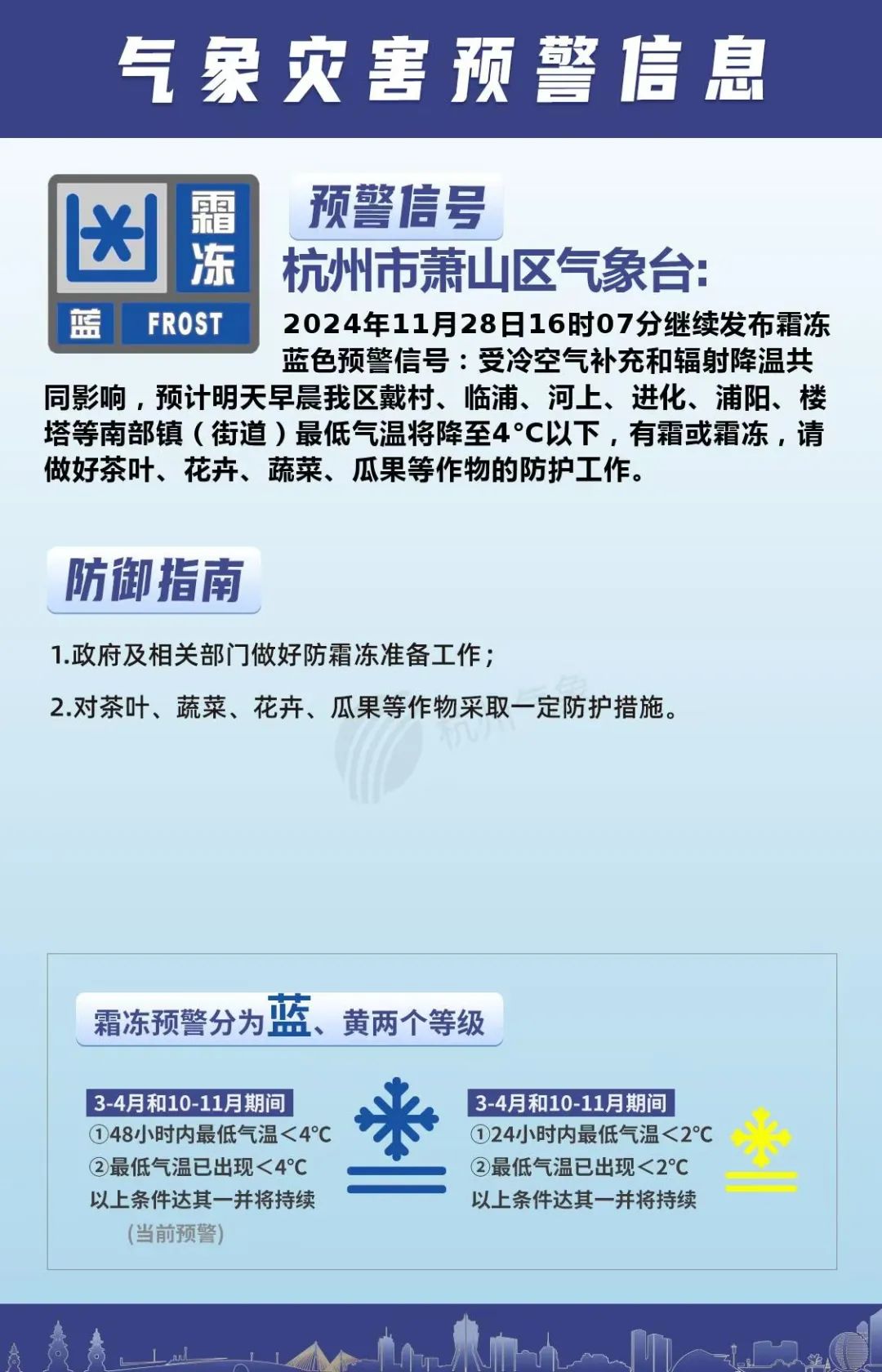 杭州市萧山区气象台2024年11月29日14时56分继续发布霜冻蓝色预警信号:受辐射降温影响,预计明天早晨我区戴村、临浦、河上、进化、浦阳、楼塔等南部镇(街道)最低气温将降至4℃以下,有霜或霜冻,请做好茶叶、花卉、蔬菜、瓜果等作物的防护工作。