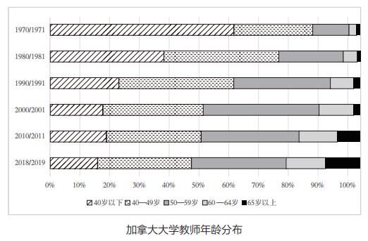 从第二次世界大战后到 21 世纪初的 60 多年里,这个问题没有那么突出,原因是有退休年龄,一般是男女老教师到了 65 岁,都强制退休了,退休金都社会化了,大学没有负担,就会省下资金聘用年轻教师。到了 21 世纪初,北美开始取消退休年龄,认为退休年龄的规定是年龄歧视,违反人权,人们不能因为年龄大而被剥夺工作权利。阿尔伯塔省 2007 年取消了退休年龄,让大家自己决定什么时候退休。当时大学领导估计很多 65 岁的老教师会推迟 5 年左右主动退休,但 5 年过去了,他们发现大家真的太爱工作了,70 岁还是不肯退休。一方面医疗条件好,大家身体不错,还能干,还想干;另一方面,中国老人退休了,要马上帮子女看孩子,加拿大没有这个文化,退休没事儿干,会造成心理问题。还有一个重要原因,正教授的工资不封顶,只要工作,就会继续涨下去,这也造成大家不舍得退休。下图来自加拿大统计局网站,从中可以看出从 20 世纪 70 年代开始,加拿大大学教师群体的年龄不断增大。