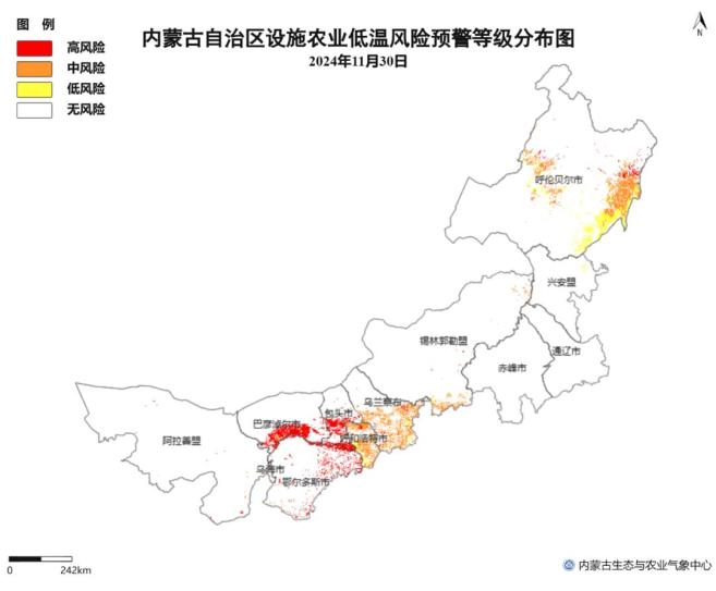 △图1 11月30日内蒙古地区设施农业低温冷害风险预警等级分布图