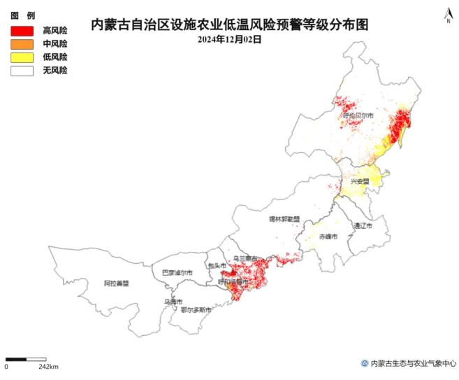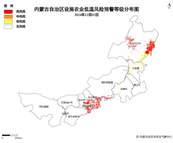△图2 12月1日内蒙古地区设施农业低温冷害风险预警等级分布图