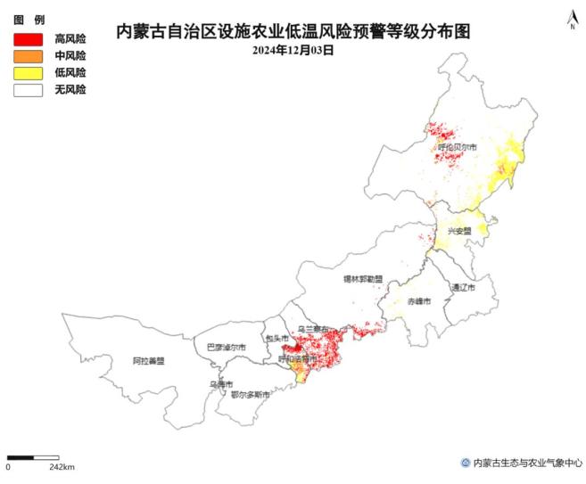 △图4 12月3日内蒙古地区设施农业低温冷害风险预警等级分布图