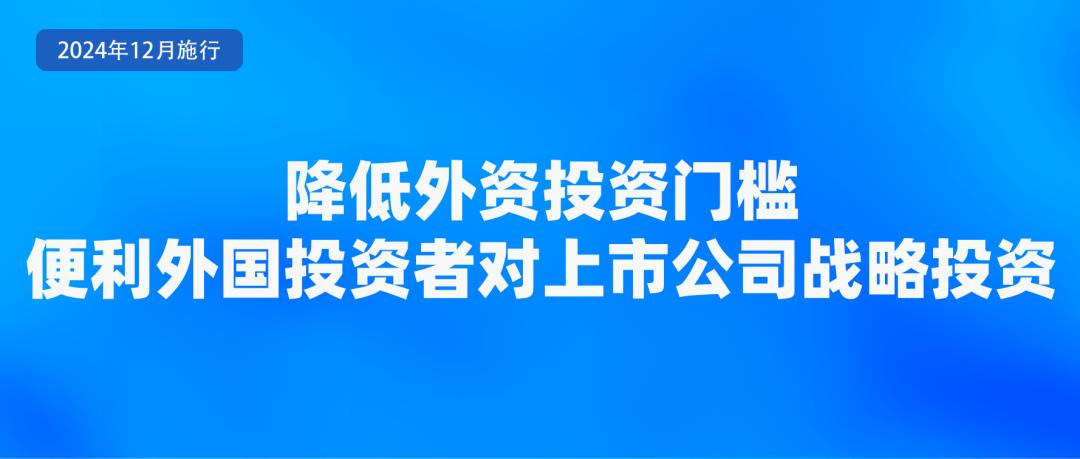 11月1日,商务部、中国证监会、国务院国资委、税务总局、市场监管总局、国家外汇局修订发布《外国投资者对上市公司战略投资管理办法》,自2024年12月2日起施行。修订后的《办法》主要是从五方面降低了投资门槛。一是允许外国自然人实施战略投资。二是放宽外国投资者的资产要求。三是增加要约收购这一战略投资方式。四是以定向发行、要约收购方式实施战略投资的,允许以境外非上市公司股份作为支付对价。五是适当降低持股比例和持股锁定期要求。