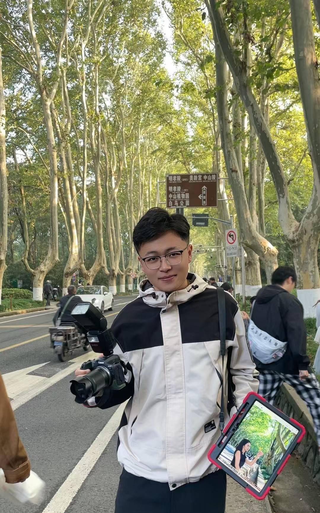 高杰来自山东临沂,摄影之路始于今年,起初只是爱好,后来逐渐发展成为了自己的副业。“我是去年来南京旅游的时候,看到梧桐大道有拍照的摄影师,加上我也比较喜欢摄影,就有业余时间做约拍的想法。”为了提升拍照质量,他特意购买了相机和镜头,因为生意不错,还准备升级装备。