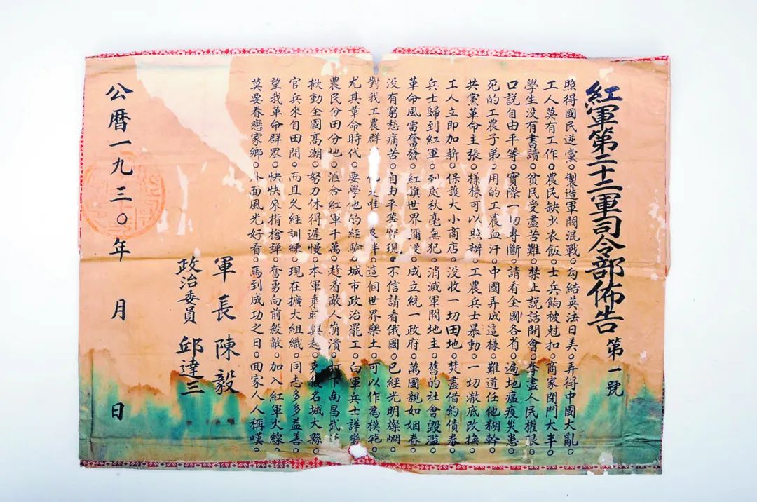 江西客家博物院收藏有一份“镇馆之宝”——1930年红军第二十二军司令部发布的第一号布告。该布告被列为国家一级文物,列入江西省第一批革命文物名录。