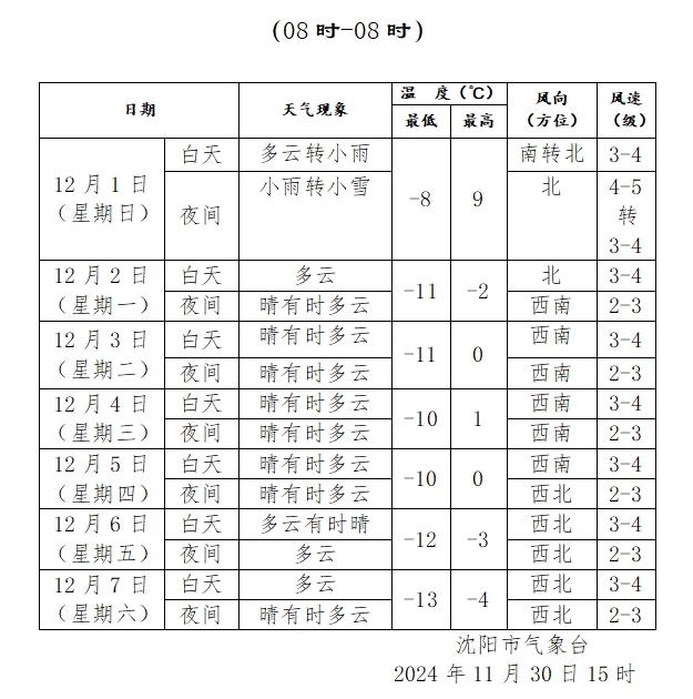 据辽宁气象,预计12月1日傍晚至夜间,我省有雨雪天气,雪后将出现寒潮和大风。中东部地区有小雪到中雪,南部地区有小雨或雨夹雪。全省气温将下降8~12℃,局部下降12~16℃;3日早晨东部地区最低气温为-20~-16℃,其他大部地区为-15~-10℃。海区最大阵风9~10级,陆地6~8级。需防范雨雪、寒潮、大风天气对交通出行、海上航运、设施农业、能源供应等的影响。