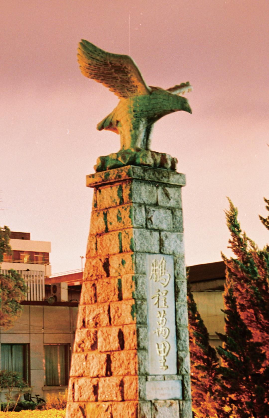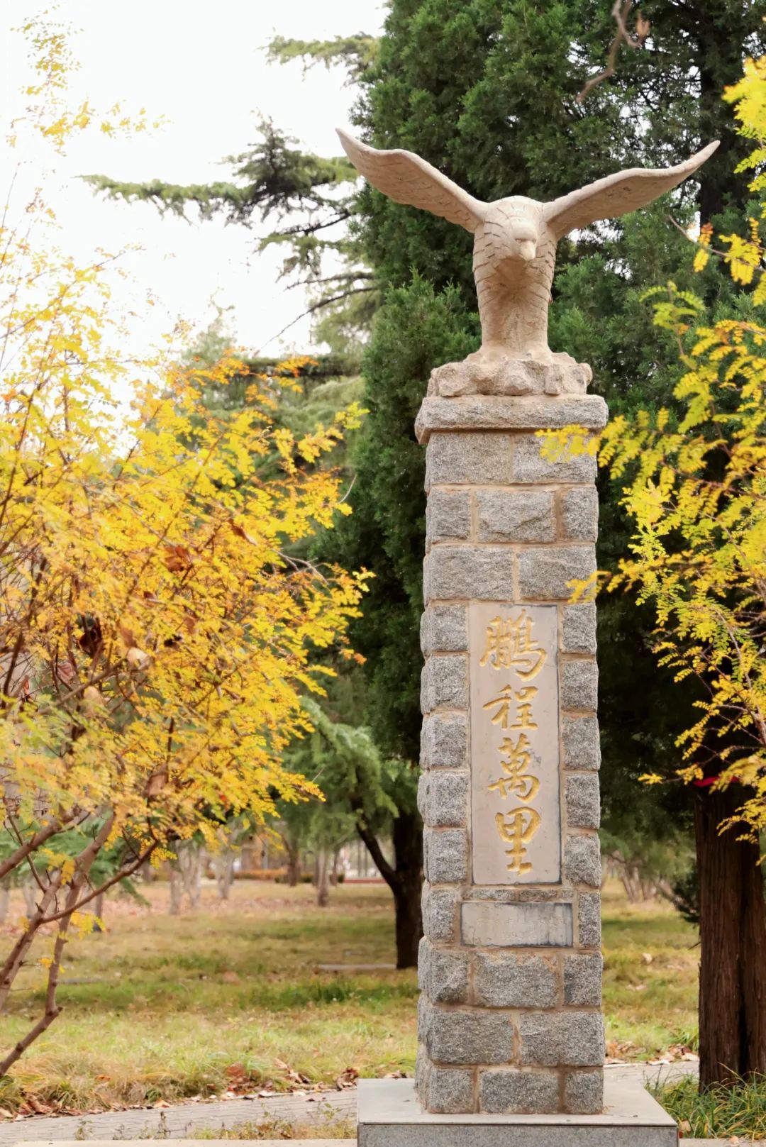 再说“鹏程万里”,碑顶是一只正展翅飞翔的雄鹰,最初安放在大礼堂、二食堂、一食堂仓库交汇处的三角地(现体育馆南门外的位置),这是学子们最聚集的地方,东有招待餐厅、大礼堂、西靠二食堂及商业街,又是同学们进出宿舍的必经之路,同学们便自觉不自觉地把自己比成雄鹰,有朝一日要展翅飞翔。2005年因体育馆建设,雄鹰西飞,落在一教后的花园中,与树为伴。少了往日的喧嚣,多了绿荫的静谧。