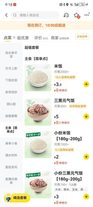 在推广小份餐品方面,美团外卖通过多种方式激励商家提供“小份菜”“小份饭”,鼓励“拼好饭”“一人食”等新模式,包括全聚德、大米先生、云海肴、老乡鸡、眉州东坡等餐饮品牌推出外卖“小份饭”,即主食(米饭、馒头等)提供的分量是常规分量的1/2-2/3,大约在150-200克。据统计,截至2024年10月,该平台上累计近168万餐饮商户提供了超过909万种“小份菜”。