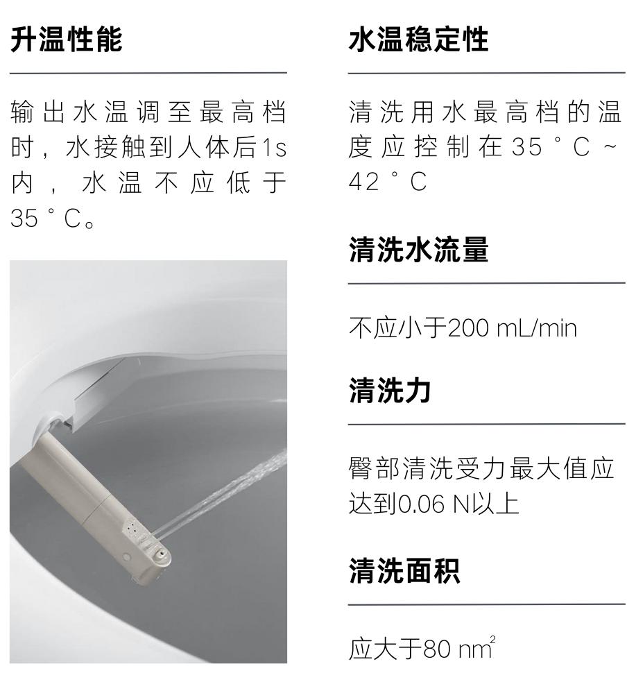 使用智能坐便器清洗时,如果水流、水温不稳定,都会让使用体验大打折扣。针对清洗功能,GB/T 34549-2024对升温性能、水温稳定性、清洗力等项提出了要求。