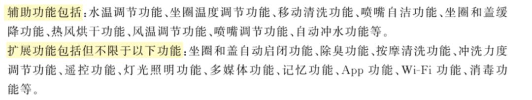 根据《卫生洁具 智能坐便器》(GB/T 34549-2024),这类产品的基础功能包括温水清洗功能(臀部清洗、妇洗功能)和坐圈加热功能。根据结构不同,可分为一体式和分体式(智能坐便器盖板)两大类。