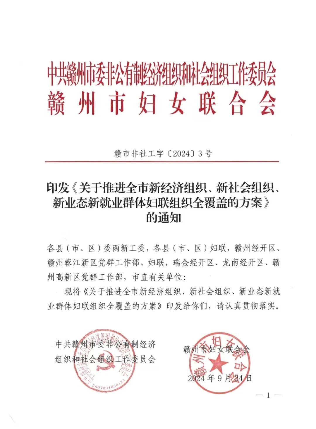 为深入贯彻落实习近平总书记关于“加大在新经济组织、新社会组织、新就业群体等新领域建立妇联组织的力度,实现全覆盖”的重要指示精神,赣州市各级妇联坚持“党建带妇建 妇建促党建”,以女性社会组织为着力点和突破口,加强部门联动,多措并举,大力推进“三新”领域妇联组织建设。截止目前,通过单独组建、行业统建、区域联建、村(社区)妇联兜底等方式,在全市女性社会组织中已建妇联组织167个,覆盖女性社会组织220个,实现我市女性社会组织妇联组织全覆盖。