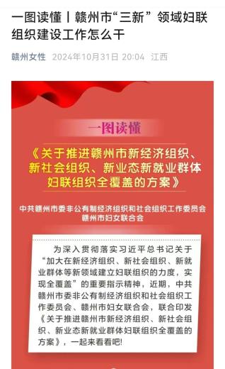 全过程服务指导,打造“服务链”全市各级妇联切实履行引领联系服务职能,全程指导推动女性社会组织妇联组织建设工作,推动“三新”领域妇联组织建设实现有形有效覆盖。通过定期召开调度会、座谈会,为女性社会组织详细解读妇联组织建设方式、流程、工作职责等;通过发放指导手册、口袋书,分享《一图读懂|赣州市“三新”领域妇联组织建设工作怎么干》,为推动女性社会组织妇联组织规范建设提供全程指导服务;利用“赣州女性”微信公众号持续推出“凝聚三新她力量”专栏,跟进“三新”领域妇联组织建设推进情况,宣传推广各地经验做法。