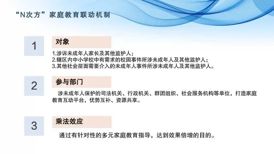 “ 孩子犯罪与家庭监护缺失、父母教育失当等有密切关系。”海淀法院少年法庭从2013年开始探索亲职教育,在全国首创“四三二一”亲职教育工作机制,深入辖区学校社区开展亲职教育讲座,惠及万余个家庭。近年来,结合《家庭教育促进法》的实施,升级建立“N次方”家庭教育联动机制,以“1+N”的方式跨界合作,融合各政府部门、司法机关、群团组织及社会力量,建立家庭法治教育共享平台。2023年,与北京市海淀区家庭教育研究会、北京青葵东方教育科技有限公司联合签订“家庭教育指导服务合作协议”,推动家庭教育工作高质量发展。