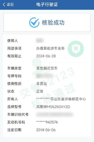 点击电子行驶证下方【下载】按钮,本人直接出示的填写用途事项和有效期后下载,授权出示的直接下载。下载的电子行驶证加注使用人、用途事项和有效期限水印,有效期最长为7个工作日。