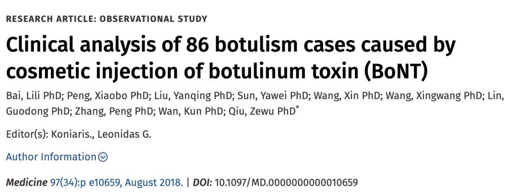 [3] Bai L, Peng X, Liu Y, et al. Clinical analysis of 86 botulism cases caused by cosmetic injection of botulinum toxin (BoNT) Medicine (Baltimore) 2018;97:e10659.