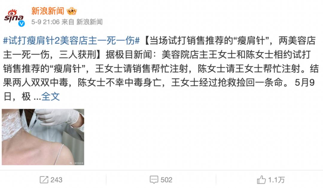 但是先别急着种草,前段时间有这样一条新闻:试打瘦肩针2美容店主一死一伤。