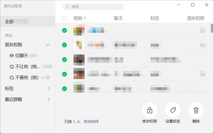 ▲自动下载文件大小设置新版PC微信进一步完善了好友管理功能。点击左侧「通讯录」按钮,进入通讯录页面后,再点击顶部的「通讯录管理」,在弹出的窗口中,可集中编辑好友备注名、标签、好友权限,更可批量删除好友。