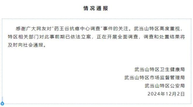 12月2日晚,武当山特区卫生健康局、武当山特区市场监督管理局、武当山特区公安局发布情况通报:感谢广大网友对“药王谷抗癌中心调查”事件的关注。武当山特区高度重视,特区相关部门对此事前期已依法立案,正在开展全面调查,调查和处置结果将及时向社会通报。