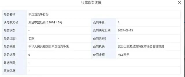 另外,因不正当竞争行为,2024年8月,药王谷中医院公司曾受到武当山旅游经济特区市监局的行政处罚,被处以罚款46.6万元。