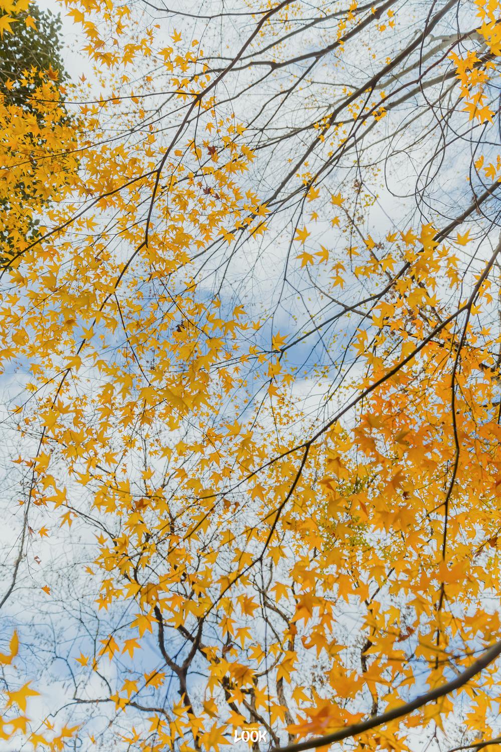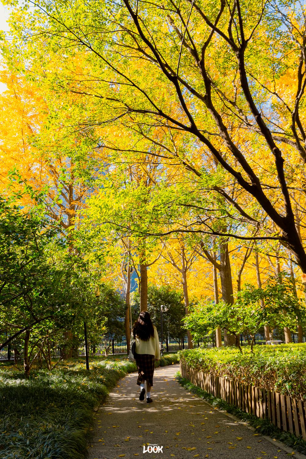 从浦东大道地铁站6号口出站向西步行1公里,便可以获得冬日银杏与外滩三件套同框的绝佳视角。周围高楼林立,唯有这一小撮银杏林,是秋冬季给人温暖的存在。
