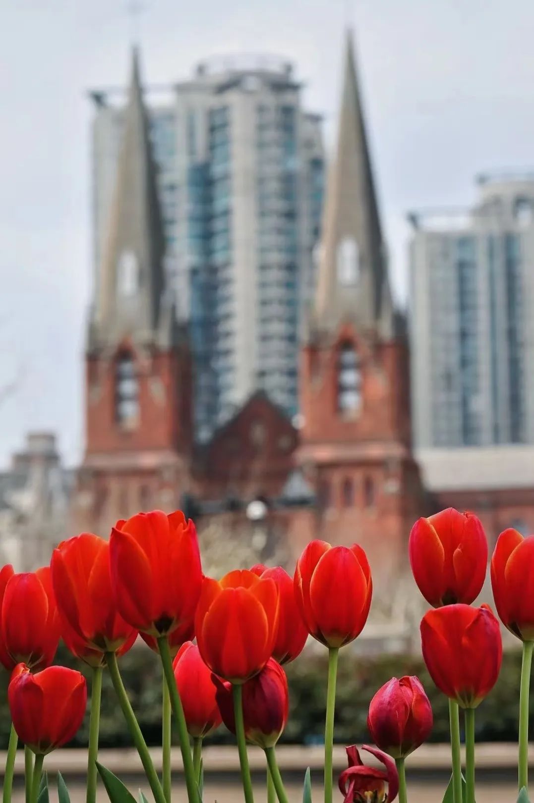 而到了每年的2、3月份,另一边马路的花箱里还会种上一排郁金香,与教堂和一旁的徐家汇书院遥相呼应。