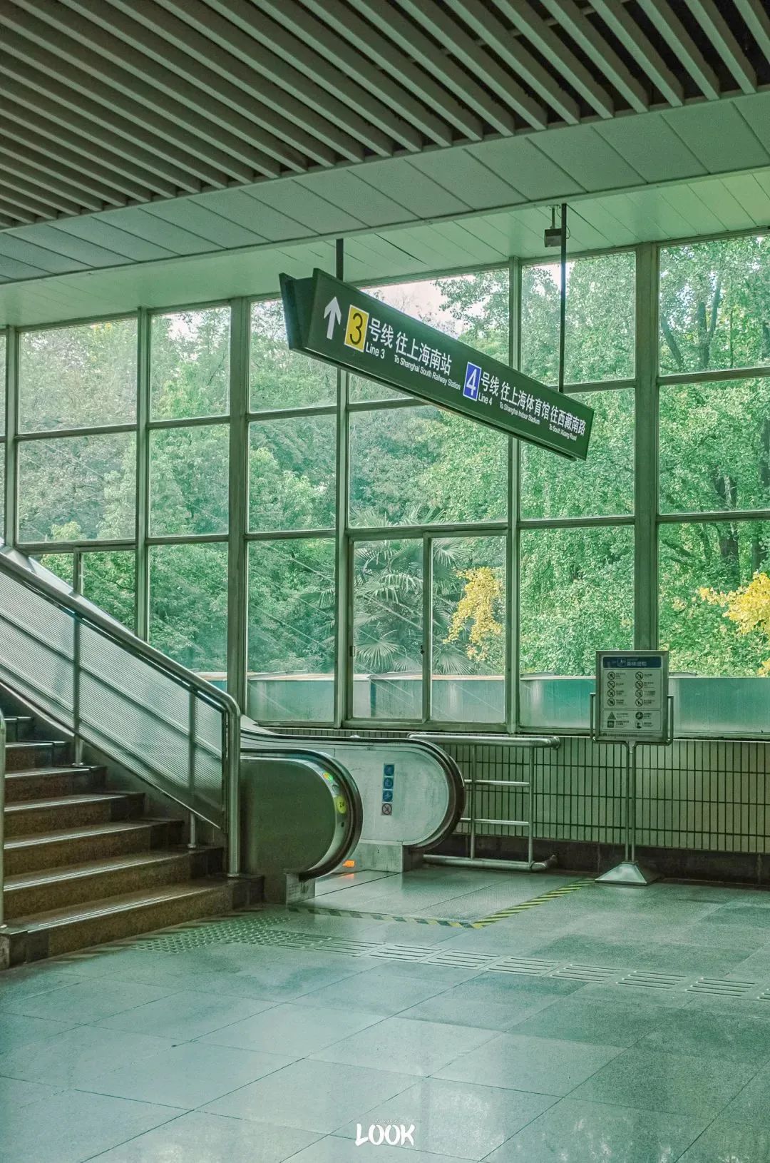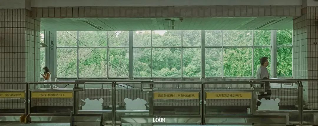不必出站,4号线延安西路站本身就是一处极美的风景。夏秋两季,窗外的树茂密而高大,被包围起来的地铁站,就像一座林中玻璃屋。