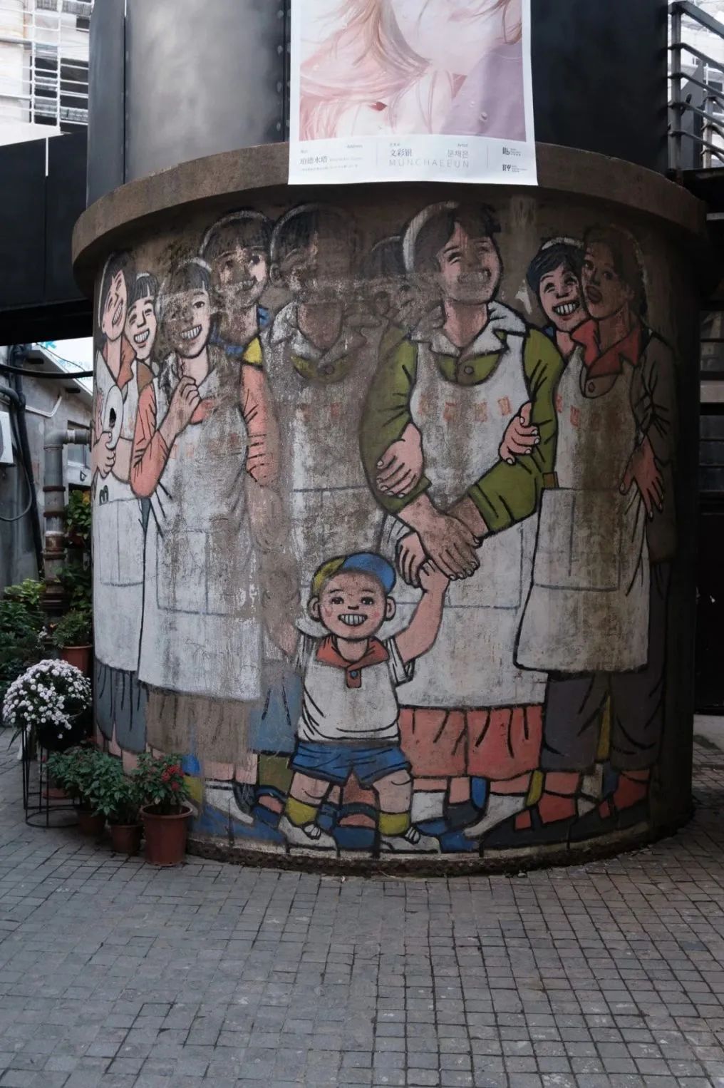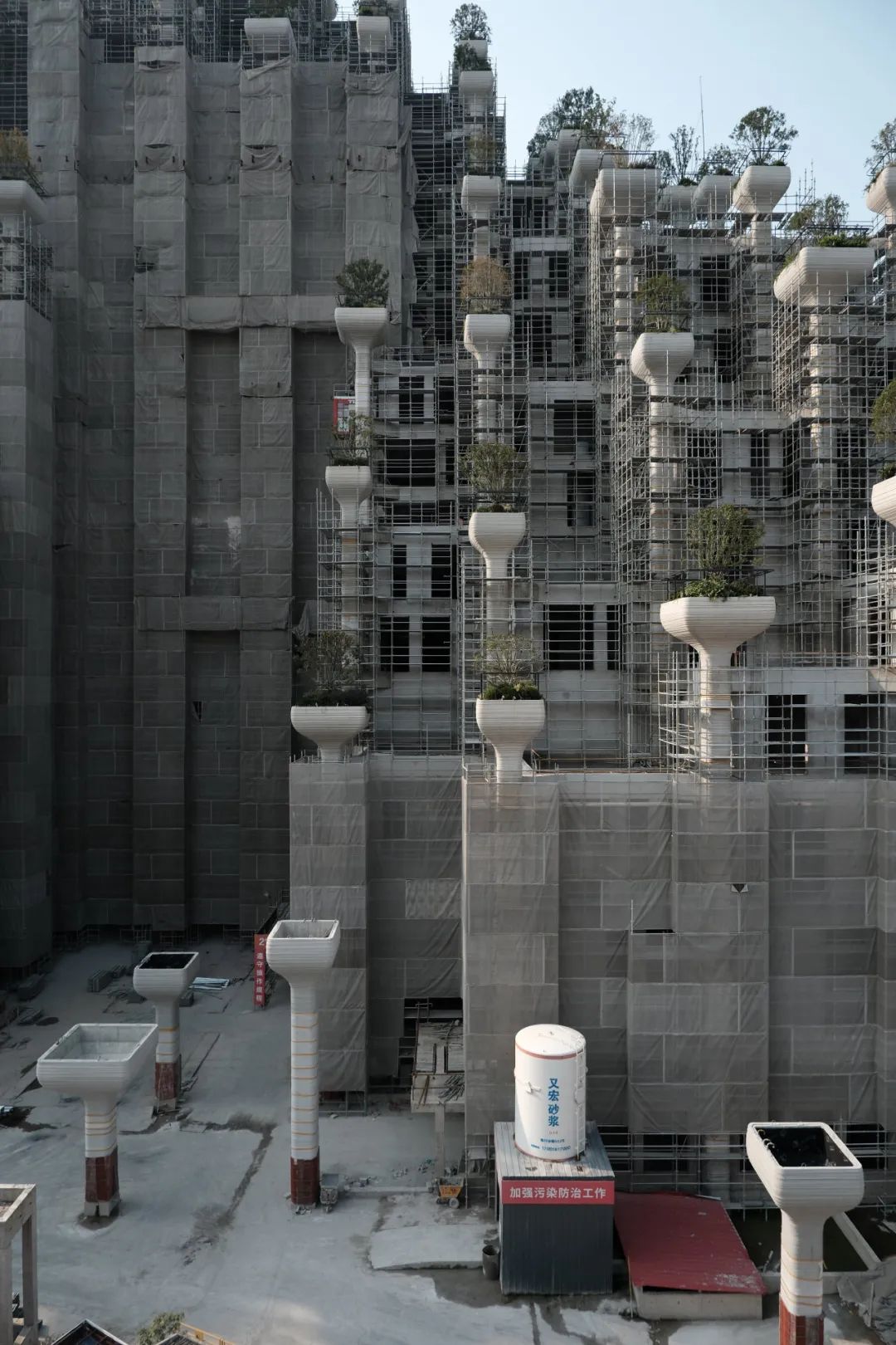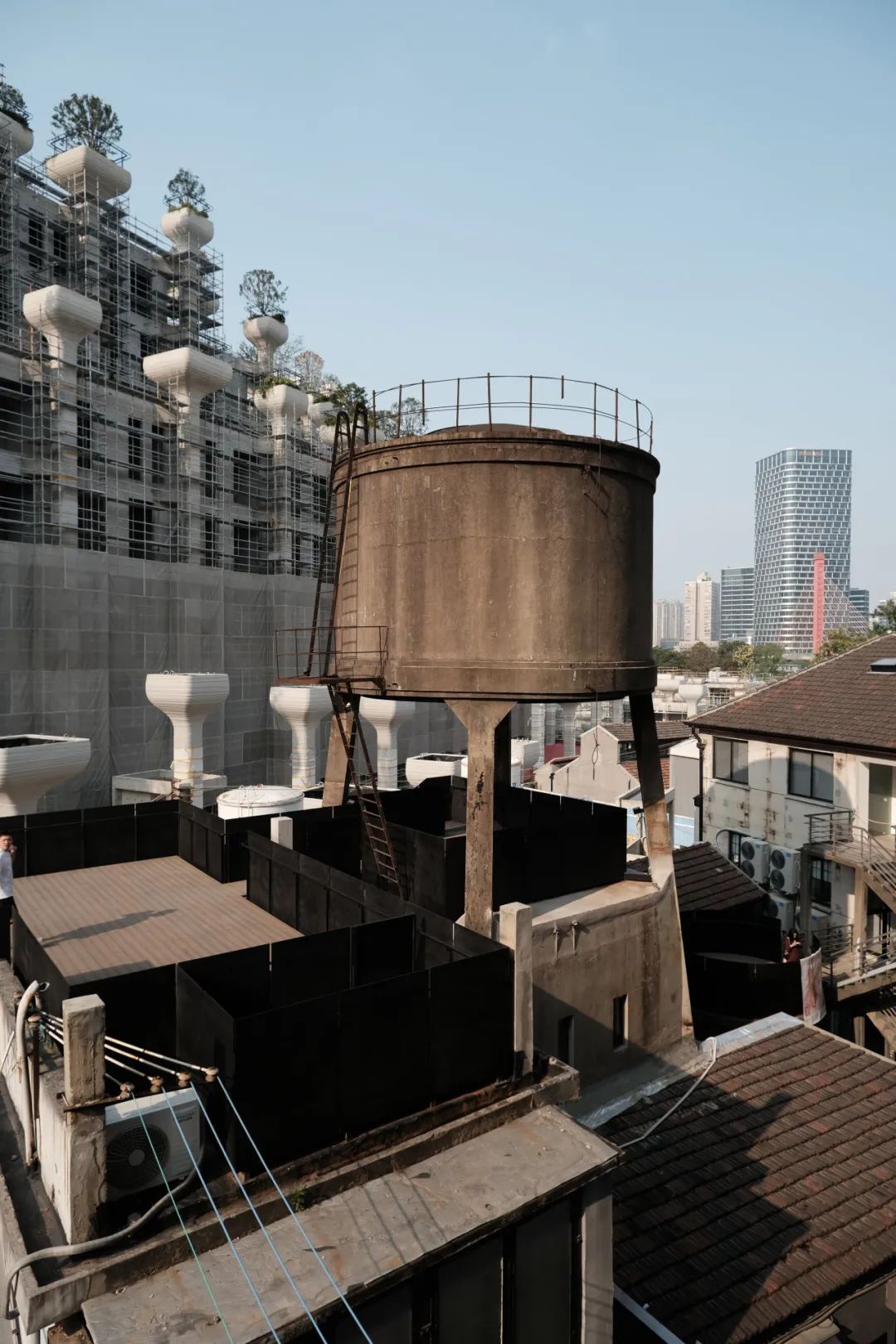 园区里保留了纺织厂时期的水塔等工业遗迹,与背后的天安千树一起共同组成了一道别样的风景。