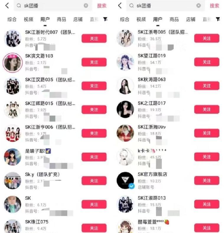 而这样的公会,同时会运营几十到上百个的直播间。以的“帅库网络”为例,旗下的团播直播间都以前缀SK某某路加数字命名,而这样的直播间,在全抖音有几十个,基本已经跑通了专业化、流水化的飞轮。