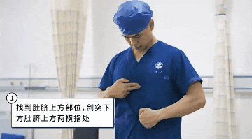 ❸ 手部位置:用一只手找到患者的肚脐上方两横指处(即肋骨下缘),另一只手紧握此拳,双手形成“拳头-掌”结构(简单记忆即为:剪刀、石头、布)。