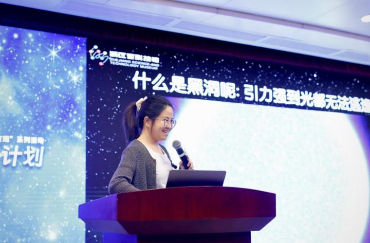 青年科学家、之江实验室博士后崔玉竹带领大家走进了黑洞的世界。“想象一下,如何将一个物体变成一个黑洞呢?我们需要将它的半径压缩到它的史瓦西半径(Schwarzschild radius),也就是物体形成黑洞时所需的临界半径,它就会变成一个黑洞。”崔玉竹的讲述如同打开了一扇通往浩瀚宇宙的大门。