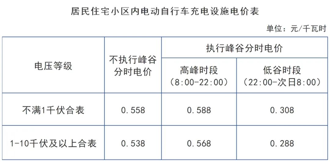 居民住宅小区内的电动自行车充电设施用电,电网企业、物业单位、充电设施运营单位、用户等环节主体间应按居民合表用户电价计收充电电费,报装主体可自愿申请执行峰谷分时电价,选定后在12个月之内保持不变。