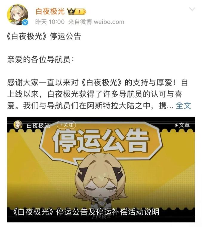 腾讯官方发布重要公告,宣布旗下游戏《白夜极光》将终止其在中国大陆区域的服务运营。