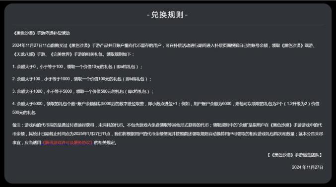 针对此次停运,腾讯推出了相应的补偿方案。在正式停服前,玩家可依据各自账户余额情况,获取《黑色沙漠》端游版本、《天龙八部》手游或《完美世界》手游的专属福利礼包。