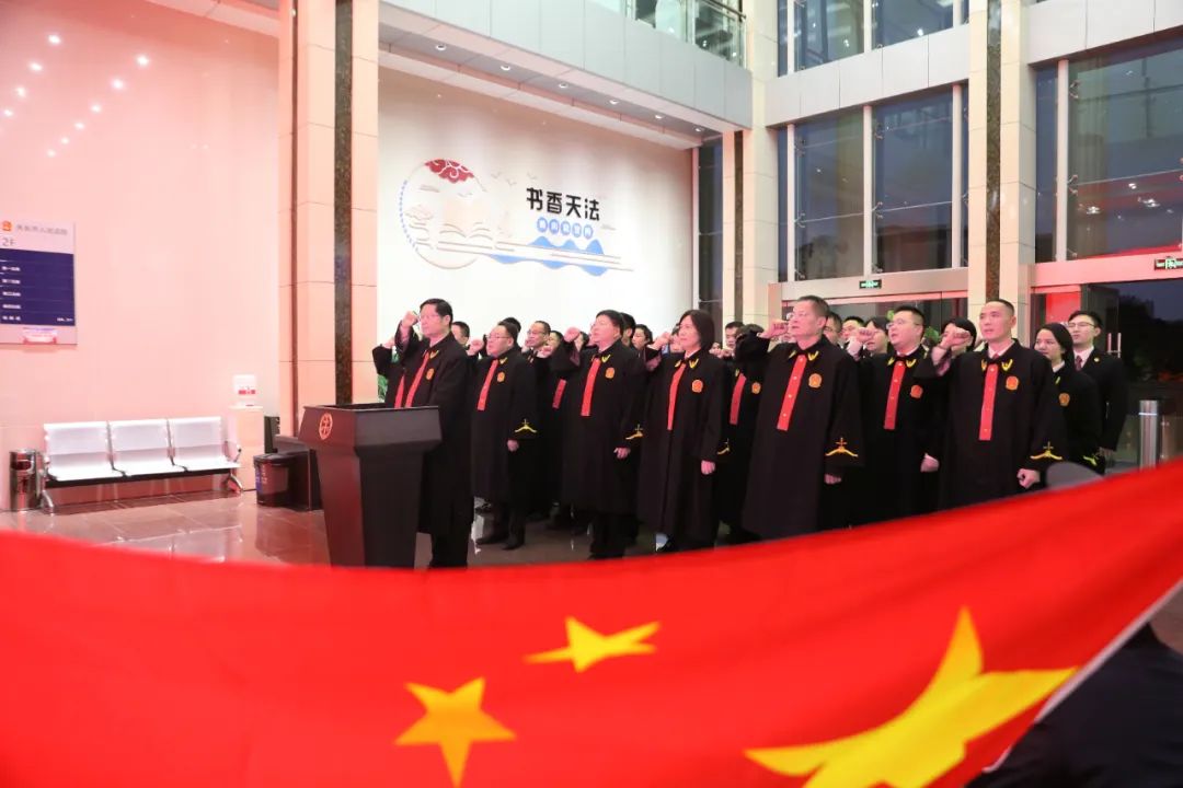 仪式现场,全体法官、法官助理整装肃立、精神饱满。领誓人侯金鹏左手抚按宪法,右手举拳,面向国旗,带领全体人员庄严宣誓:“忠于中华人民共和国宪法,维护宪法权威,履行法定职责……”。铿锵有力的誓言在仪式现场回响,表达了对宪法精神、宪法权威和宪法尊严的坚定信仰,汇聚起以审判工作现代化支撑和服务中国式现代化的磅礴力量。