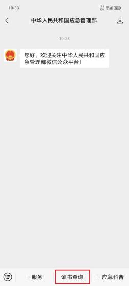 方法一:关注“应急管理部”微信公众号,通过底部菜单栏【证书查询】,进入查询平台。